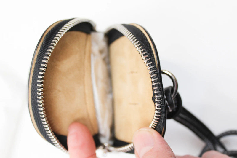 Features: Features a unique cap-shaped body with a silver-tone zip closure and a branded leather puller. Includes a thin leather shoulder strap, silver-finish hardware, and an embossed logo on the back.