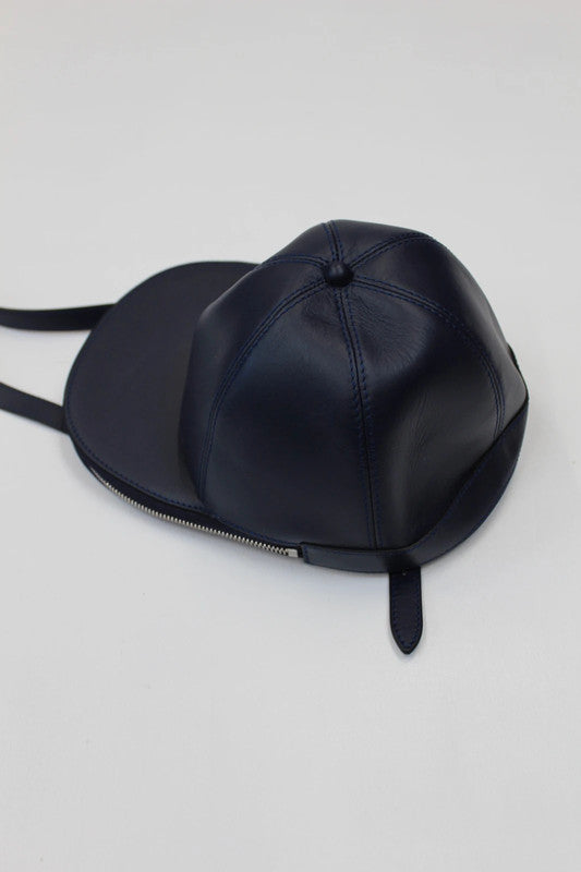 Handmade in Italy. A bold and sculptural statement piece crafted from smooth black calf leather. This bag is meticulously constructed to replicate a classic baseball cap silhouette. It is a versatile accessory that can be worn crossbody or over the shoulder, featuring a zip closure integrated into the structure of the bag.