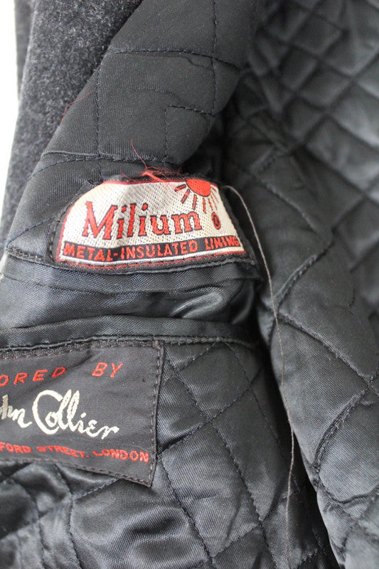 John Collier Tailors wool coat with metal Milium insulation. Premium high quality wool coat in classic charcoal grey vintage overcoat in a sophisticated single-breasted style. This piece offers a structured silhouette, perfect for winter and autumn layering.
